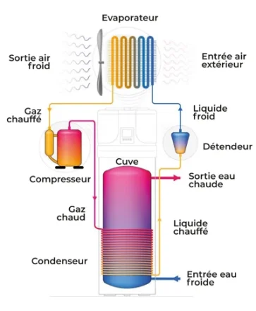 ◾ Le passage de l’état liquide à l’état gazeux de ce fluide à l’aide d’un compresseur, génère une augmentation de température qui permet de chauffer l’eau en circulant autour de la cuve.
