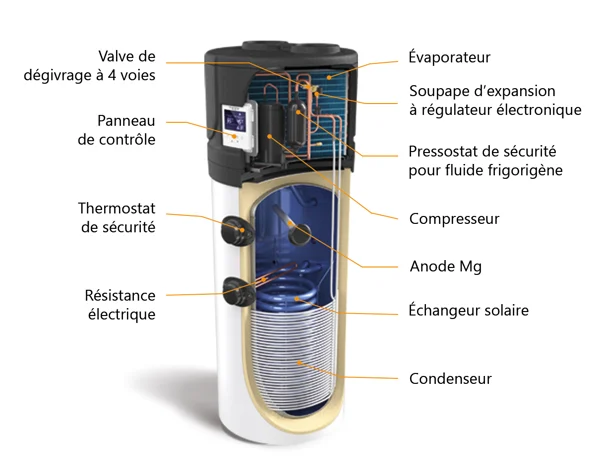 Le principe de fonctionnement est celui d'une pompe à chaleur aérothermique (air/eau).