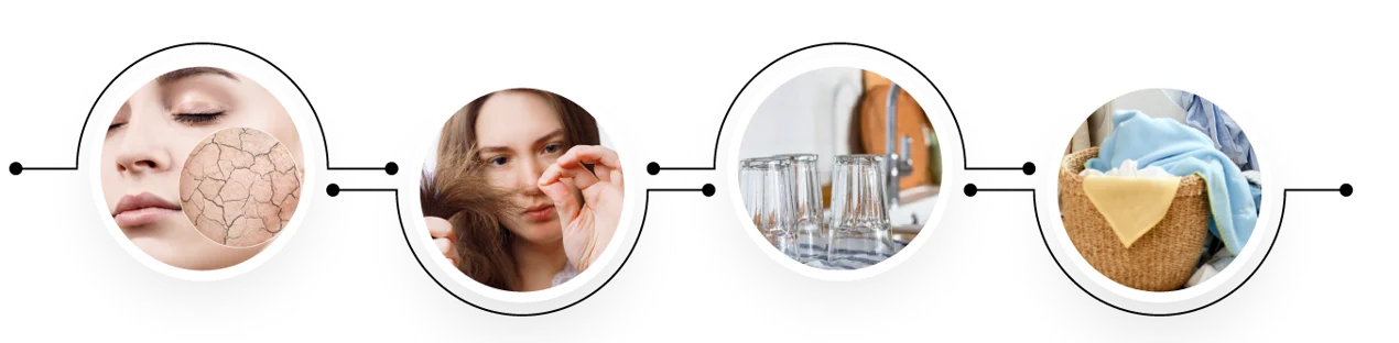 Ce traitement basique est suffisant pour la consommation domestique malgré le goût et l’odeur désagréable du chlore. Dans l'eau de ville, avec les particules solides et les bactéries, nous trouvons aussi une grosse quantité des minéraux, tels que le calcium et le magnésium. Ils sont importants pour le corps humain, mais en grosses quantités ils forment le calcaire. Plus l'eau est chargée de ces minéraux, plus elle est dure. Et cela n'est pas traité dans les centres de traitement de la ville.